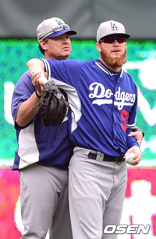 11일 오전(이하 한국시간) 미국 오하이오주 신시내티 그레이트 아메리칸 볼파크에서 열리는 '2014 메이저리그' 신시내티 레즈와 LA 다저스의 경기에 앞서 LA 다저스 허니컷 코치가 J.P 하웰의 투구폼에 대해 조언을 하고 있다.