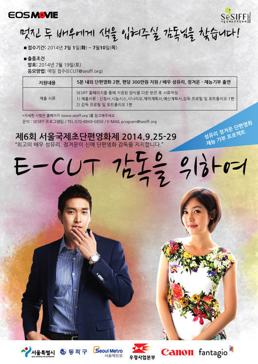 제 6회 서울국제초단편영화제의 단편영화제작지원 EOS MOVIE프로젝트 ‘E-CUT감독을 위하여'는 배우와 MC를 넘나들며 많은 사랑을 받고 있는 성유리와 드라마 '신의 선물'에서 열연한 정겨운을 주인공으로 한 시나리오를 공모한다.
