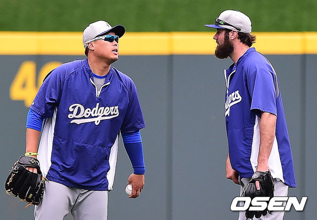 11일 오전(이하 한국시간) 미국 오하이오주 신시내티 그레이트 아메리칸 볼파크에서 열리는 '2014 메이저리그' 신시내티 레즈와 LA 다저스의 경기에 앞서 LA 다저스 류현진이 밴 슬라이크와 이야기를 나누고 있다.
