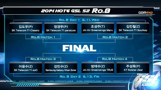 6월 13일 8강 2일차에는 GSL 시즌 1 준우승자인 어윤수와 신예 강민수의 저그대전과 ‘폭주기관차’ 방태수와 ‘챔피언’ 주성욱의 대결이 기다리고 있다.