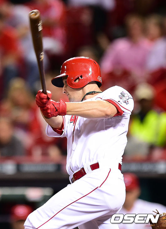 11일 오전(이하 한국시간) 미국 오하이오주 신시내티 그레이트 아메리칸 볼파크에서 열린 '2014 메이저리그' 신시내티 레즈와 LA 다저스의 경기, 3회말 2사 신시내티 투수 마이크 리크가 안타를 때리고 있다.