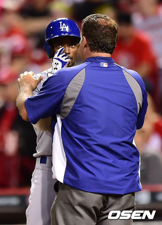 11일 오전(이하 한국시간) 미국 오하이오주 신시내티 그레이트 아메리칸 볼파크에서 열린 '2014 메이저리그' 신시내티 레즈와 LA 다저스의 경기, 3회초 1사 LA 다저스 디 고든이 자신이 타격한 파울 타구가 헬멧이 맞은 뒤 구단 관계자와 이야기를 나누고 있다.