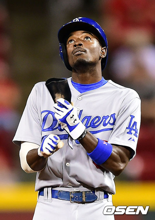 11일 오전(이하 한국시간) 미국 오하이오주 신시내티 그레이트 아메리칸 볼파크에서 열린 '2014 메이저리그' 신시내티 레즈와 LA 다저스의 경기, 5회초 1사 1,2루 LA 다저스 디 고든이 1타점 적시 2루타를 때린 뒤 기뻐하고 있다.