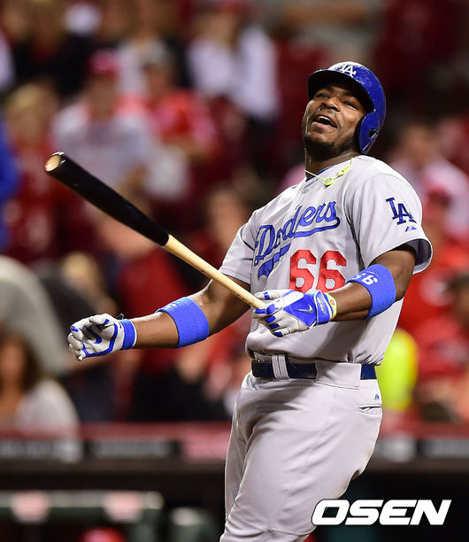 11일 오전(이하 한국시간) 미국 오하이오주 신시내티 그레이트 아메리칸 볼파크에서 열린 '2014 메이저리그' 신시내티 레즈와 LA 다저스의 경기, 5회초 1사 1루 LA 다저스 야실 푸이그가 삼진을 당한 뒤 아쉬워하고 있다.
