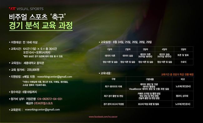 스포츠 영상분석 전문회사인 비주얼스포츠가 월드컵 기간 중 5일간(6월 24~26일, 28~29일 오전 10시~오후 5시) 세종대학교 용덕관에서 ‘제1회 비주얼스포츠 축구 경기분석 교육’을 실시할 예정이다.
