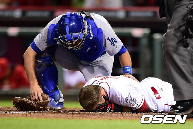 11일 오전(이하 한국시간) 미국 오하이오주 신시내티 그레이트 아메리칸 볼파크에서 열린 '2014 메이저리그' 신시내티 레즈와 LA 다저스의 경기, 5회말 2사 신시내티 잭 코자트가 베켓이 던진 공에 맞아 고통스러워 하고 있다.