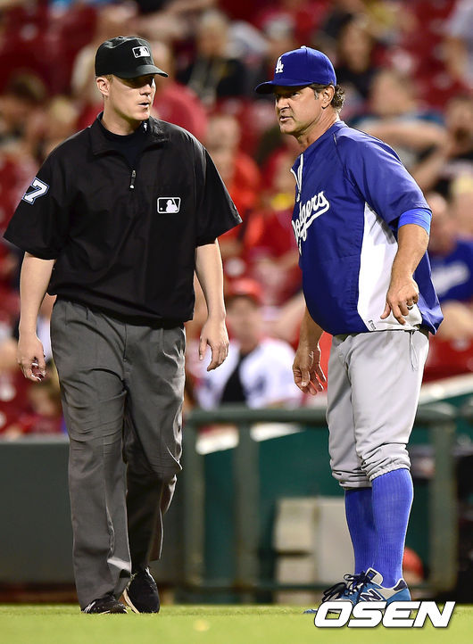 11일 오전(이하 한국시간) 미국 오하이오주 신시내티 그레이트 아메리칸 볼파크에서 열린 '2014 메이저리그' 신시내티 레즈와 LA 다저스의 경기, 6회초 1사 1루 LA 다저스 돈 매팅리 감독이 이디어의 1루 아웃판정에 대해 비디오 요청을 하고 있다.