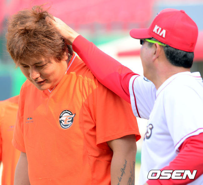 11일 오후 광주-KIA 챔피언스필드에서 열리는 2014 한국야쿠르트 세븐 프로야구 KIA 타이거즈와 한화 이글스의 경기에 앞서 한화 김태균이 KIA 한대화 코치에게 인사를 하고 있다.