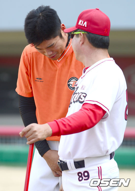 11일 오후 광주-KIA 챔피언스필드에서 열리는 2014 한국야쿠르트 세븐 프로야구 KIA 타이거즈와 한화 이글스의 경기에 앞서 한화 최진행이 KIA 한대화 코치에게 인사를 하고 있다.
