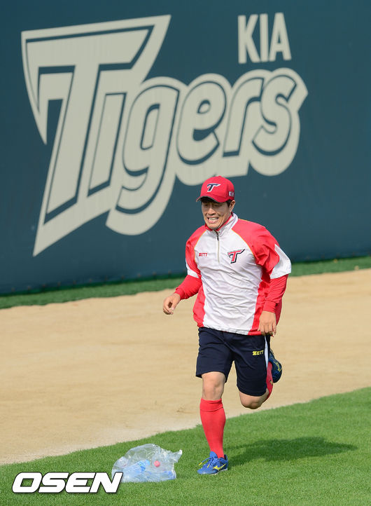 11일 오후 광주-KIA 챔피언스필드에서 열리는 2014 한국야쿠르트 세븐 프로야구 KIA 타이거즈와 한화 이글스의 경기에 앞서 KIA 김병현이 몸을 풀고 있다. 김병현은 지난 10일 경기에 시즌 첫 선발등판해 2⅔이닝 7실점 기록했다.