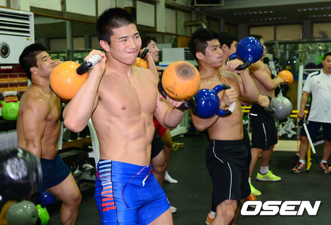 남자 레슬링 국가대표 선수들이 훈련을 하고 있다.