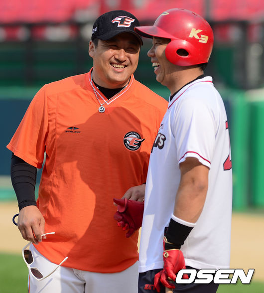 11일 오후 광주-KIA 챔피언스필드에서 열리는 2014 한국야쿠르트 세븐 프로야구 KIA 타이거즈와 한화 이글스의 경기에 앞서 KIA 이범호와 한화 조인성이 이야기를 나누고 있다.
