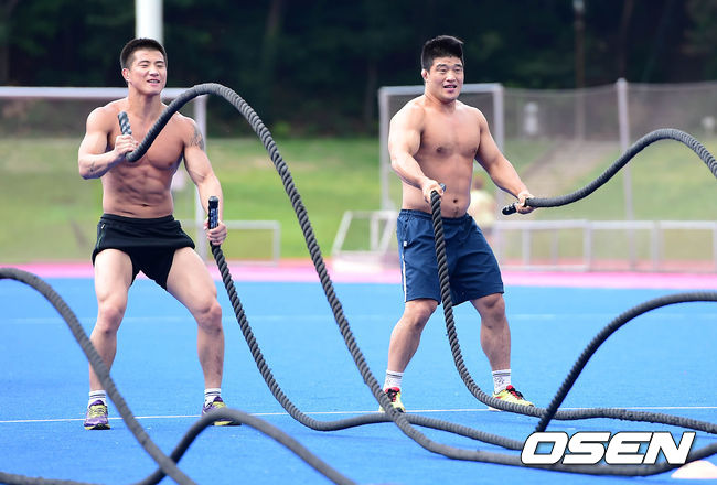 남자 레슬링 국가대표 선수들이 훈련을 하고 있다.