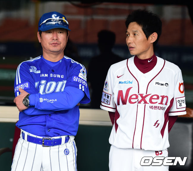 삼성 류중일, 넥센 염경엽 감독이 더그아웃에서 그라운드를 바라보며 이야기를 나누고 있다./jpnews@osen.co.kr