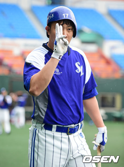 삼성 채태인이 그라운드에서 훈련을 마치고 더그아웃으로 향하며 브이 포즈를 취하고 있다. /jpnews@osen.co.kr