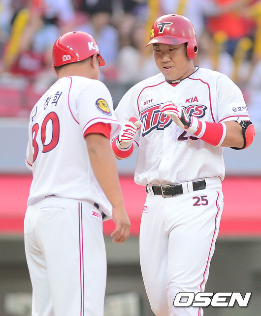 11일 오후 광주-KIA 챔피언스필드에서 열리는 2014 한국야쿠르트 세븐 프로야구 KIA 타이거즈와 한화 이글스의 경기,2회말 무사 1루 KIA 이범호가 역전 2점 홈런을 날리고 김창희 코치와 하이파이브를 하고 있다. 이범호는 이번 홈런으로 통산 33번째 2100루타를 달성했다.