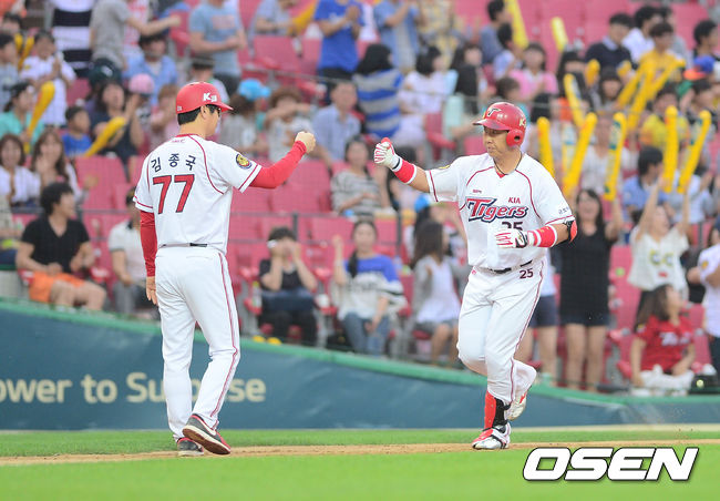 11일 오후 광주-KIA 챔피언스필드에서 열리는 2014 한국야쿠르트 세븐 프로야구 KIA 타이거즈와 한화 이글스의 경기,2회말 무사 1루 KIA 이범호가 역전 2점 홈런을 날리고 베이스를 돌고 있다. 이범호는 이번 홈런으로 통산 33번째 2100루타를 달성했다.