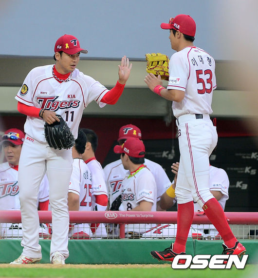 11일 오후 광주-KIA 챔피언스필드에서 열리는 2014 한국야쿠르트 세븐 프로야구 KIA 타이거즈와 한화 이글스의 경기,3회초 1사 1루 한화 한상훈의 안타성 타구를 KIA 이대형 중견수가 호수비 펼치며 잡아냈다. 이후 이대형은 2루로 진루했던 조인성을 포수아웃으로 잡은 뒤 임준섭 선발투수와 하이파이브를 하고 있다.