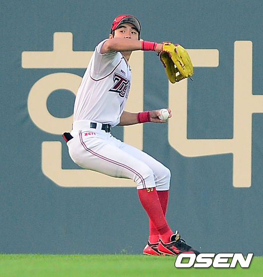 11일 오후 광주-KIA 챔피언스필드에서 열리는 2014 한국야쿠르트 세븐 프로야구 KIA 타이거즈와 한화 이글스의 경기,3회초 1사 1루 한화 한상훈의 안타성 타구를 KIA 이대형 중견수가 호수비 펼치며 잡아냈다. 이대형이 2루로 진루했던 1루 주자 조인성을 송구로 잡아내고 있다.