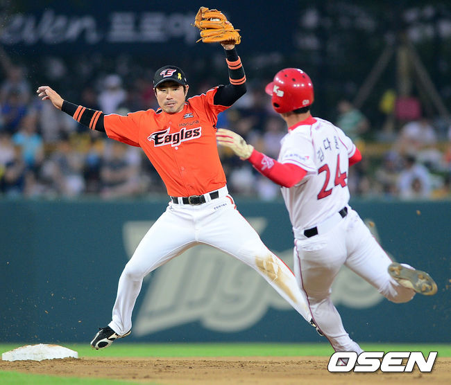 11일 오후 광주-KIA 챔피언스필드에서 열리는 2014 한국야쿠르트 세븐 프로야구 KIA 타이거즈와 한화 이글스의 경기,4회말 1사 1루 KIA 강한울의 타석때 한화 한상훈이 도루 시도한 1루 주자 김다원을 태그아웃으로 잡아내고 있다.
