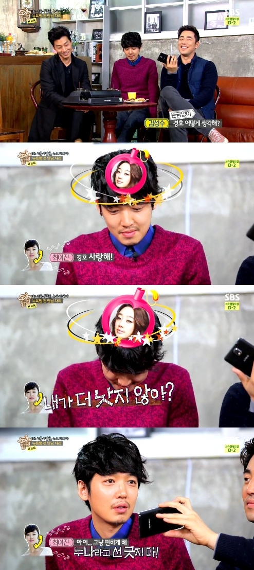 그러자 최여진은 “경호 사랑해”라고 답해 정경호를 당황하게 했다. 김성수는 박장대소 하며 “너 얘 여자친구 있는 건 알지? 여자친구가 어떤 그룹에 소속되어있는 지도 알지?”라고 물었다. 정경호는 소녀시대의 수영과 교제 중이다.
