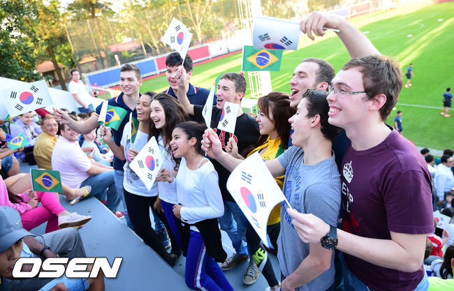 페드로 바소 경기장에서 홍명보호의 첫 훈련을 보기 위해 표를 사서 들어온 브라질 현지인들이 포즈를 취하고 있다.