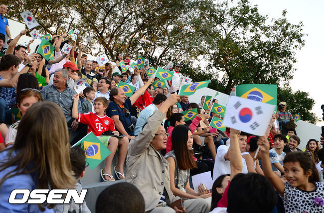 페드로 바소 경기장에서 홍명보호의 첫 훈련을 보기 위해 표를 사서 들어온 브라질 현지인들과 교민들이 태극기와 브라질 국기를 흔들고 있다.