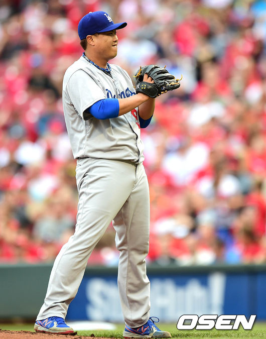 12일(한국시간) 신시내티에서 열린 신시내티 레즈와 LA 다저스의 경기 시즌 8승을 노리는 류현진이 볼 판정에 아쉬워 하고 있다.