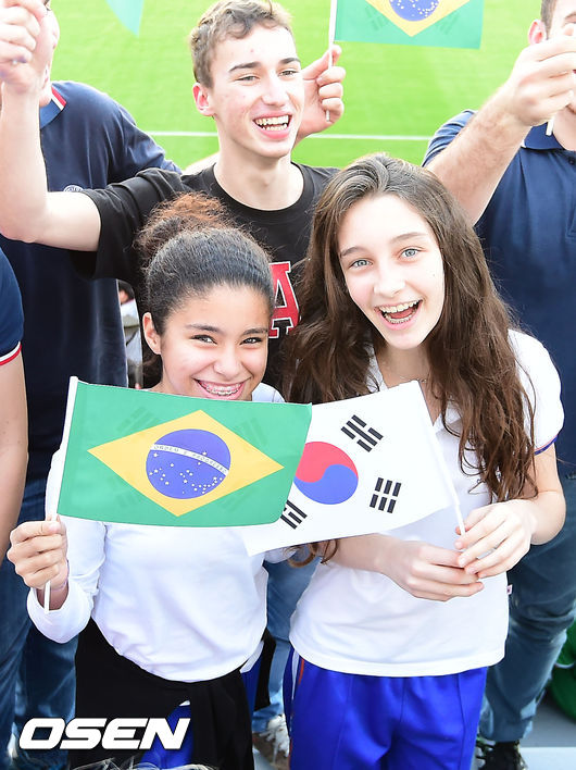 페드로 바소 경기장에서 홍명보호의 첫 훈련을 보기 위해 표를 사서 들어온 브라질 현지인들이 환하게 미소짓고 있다.