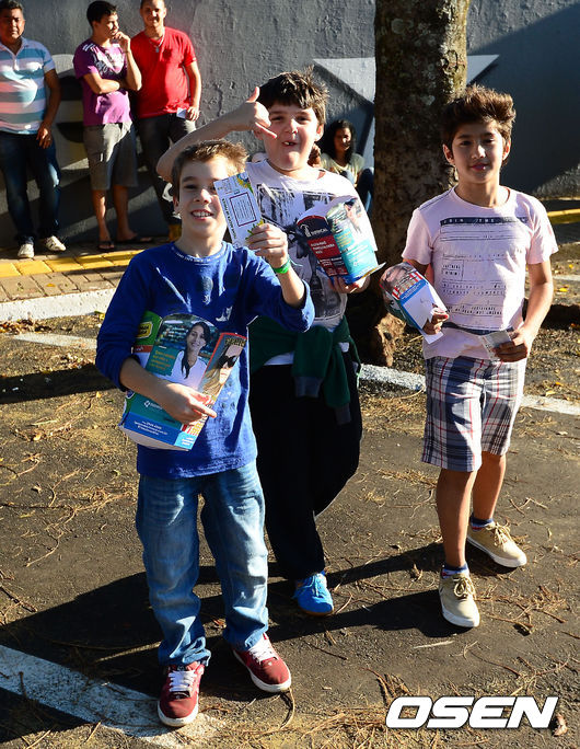페드로 바소 경기장에서 홍명보호의 첫 훈련을 보기 위해 표를 사서 들어온 브라질 현지인들이 포즈를 취하고 있다.