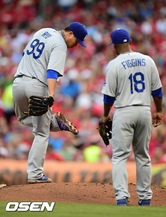 12일(한국시간) 신시내티에서 열린 신시내티 레즈와 LA 다저스의 경기 2회말 필립스를 상대하며 마운드에서 미끄러진 류현진이 스파이크를 확인하고 있다.