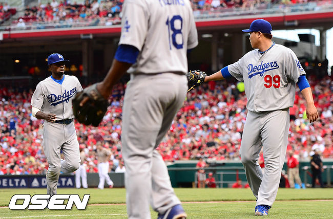 12일(한국시간) 신시내티에서 열린 신시내티 레즈와 LA 다저스의 경기 2회말 1사 1,2루에서 다저스 고든의 호수비로 위기를 벗어난 류현진이 더그아웃으로 가며 고든과 하이파이브를 하고 있다.