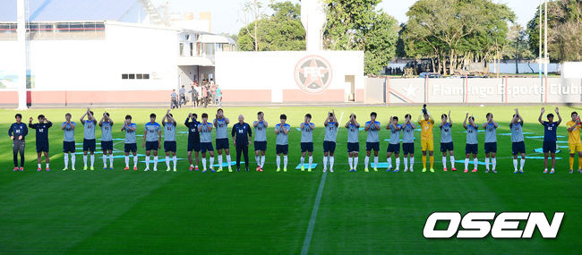 페드로 바소 경기장에서 홍명보호의 첫 훈련을 보기 위해 표를 사서 들어온 브라질 현지 팬과 교민들에게 홍명보호가 박수를 보내고 있다.