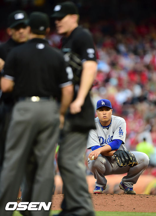 12일(한국시간) 신시내티에서 열린 신시내티 레즈와 LA 다저스의 경기 3회말 2사 1,2루 신시내티 보토에게 좌전 2타점 적시타를 허용한 류현진이 마운드에 앉아 아쉬운 표정을 짓고 있다.
