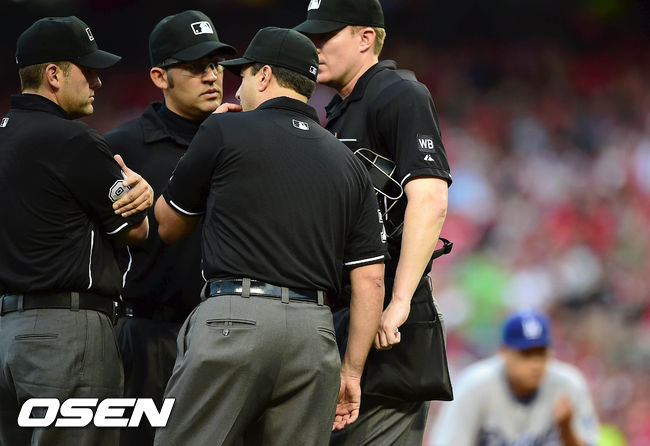 12일(한국시간) 신시내티에서 열린 신시내티 레즈와 LA 다저스의 경기 3회말 2사 1,2루 신시내티 보토의 좌전 2타점 적시타때 홈으로 향하던 2루주자 해밀턴이 다저스의 3루 코치와 충돌했다는 매팅리 감독의 어필에 심판진이 이야기를 나누고 있다.