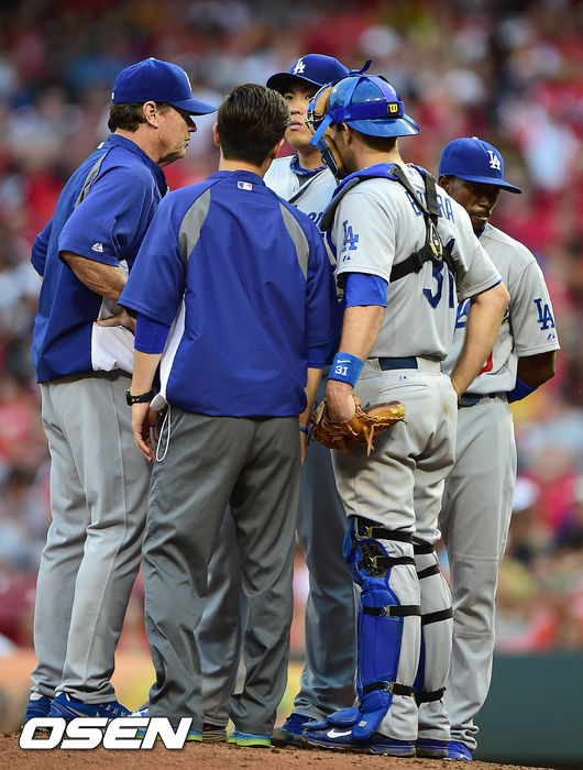 12일(한국시간) 신시내티에서 열린 신시내티 레즈와 LA 다저스의 경기 3회말 2사 2루에서 마운드를 방문한 다저스 허니컷 코치가 류현진과 이야기를 나누고 있다.