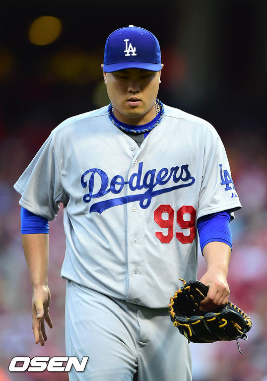12일(한국시간) 신시내티에서 열린 신시내티 레즈와 LA 다저스의 경기 3회말 수비를 마친 다저스 류현진이 더그아웃으로 향하고 있다.