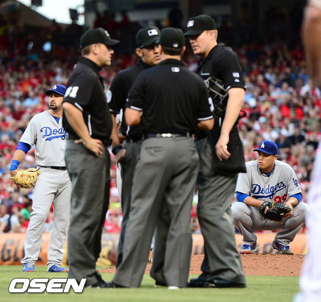 12일(한국시간) 신시내티에서 열린 신시내티 레즈와 LA 다저스의 경기 3회말 2사 1,2루에서 다저스 류현진이 신시내티 보토의 2타점 적시타때 1루주자 해밀턴이 홈으로 들어가는 과정에서 다저스 3루코치와 충돌에 대해 이야기를 나누는 심판진을 바라보고 있다.