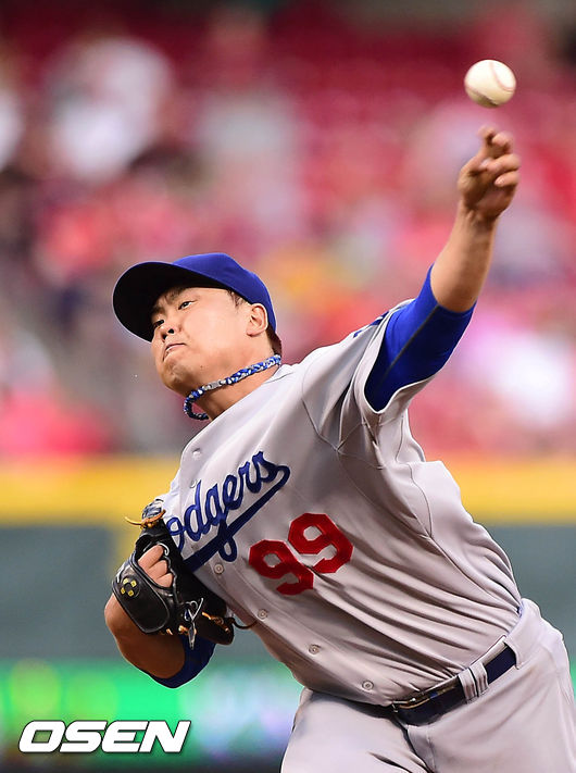 12일(한국시간) 신시내티에서 열린 신시내티 레즈와 LA 다저스의 경기 1회말 다저스 선발 투수 류현진이 힘차게 공을 던지고 있다.