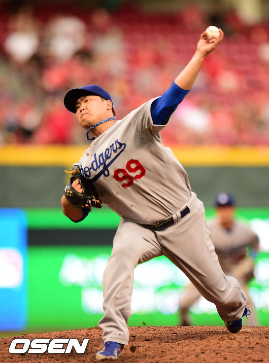 12일(한국시간) 신시내티에서 열린 신시내티 레즈와 LA 다저스의 경기 1회말 다저스 선발 투수 류현진이 힘차게 공을 던지고 있다.