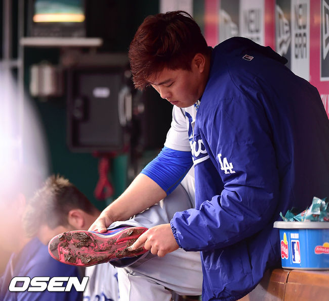 12일(한국시간) 신시내티에서 열린 신시내티 레즈와 LA 다저스의 경기 5회말 수비를 마친 다저스 류현진이 더그아웃에서 스파이크를 청소하고 있다.