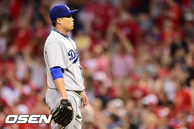 12일(한국시간) 신시내티에서 열린 신시내티 레즈와 LA 다저스의 경기 6회말 1사에서 다저스 류현진이 신시내티 브루스에게 우중월 솔로 홈런을 허용하고 있다.