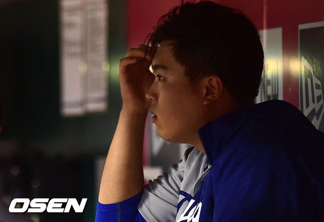 12일(한국시간) 신시내티에서 열린 신시내티 레즈와 LA 다저스의 경기 6회말 수비를 마친 다저스 류현진이 더그아웃에서 아쉬운 표정을 짓고 있다.