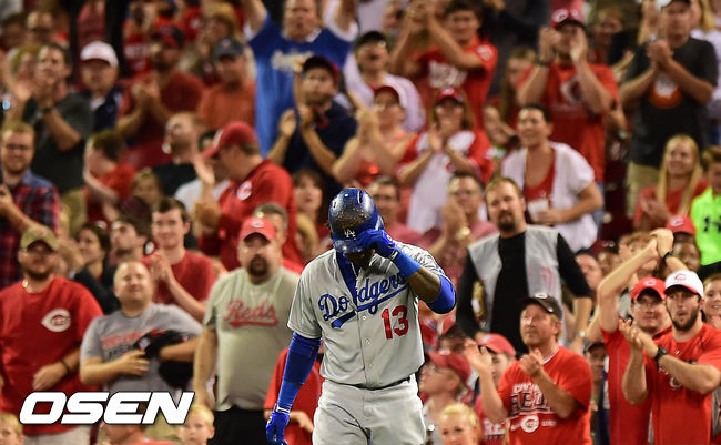 12일(한국시간) 신시내티에서 열린 신시내티 레즈와 LA 다저스의 경기 7회초 1사 만루에서 다저스 라미레즈가 병살타를 치고 아쉬운 표정을 짓고 있다.