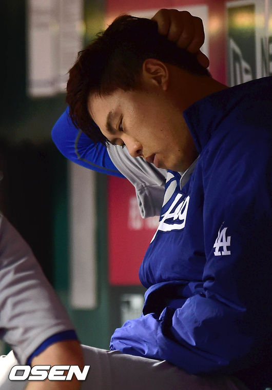 12일(한국시간) 신시내티에서 열린 신시내티 레즈와 LA 다저스의 경기 6회말 수비를 마친 다저스 류현진이 더그아웃에서 아쉬운 표정을 짓고 있다.