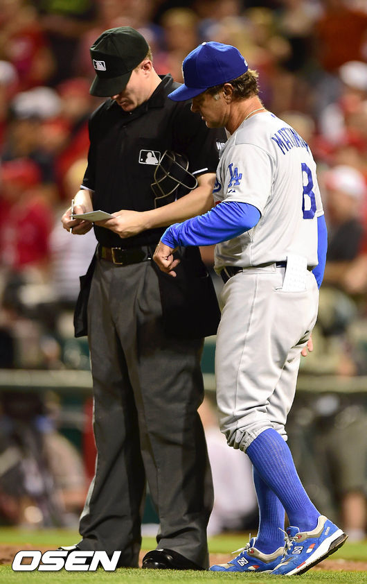 12일(한국시간) 신시내티에서 열린 신시내티 레즈와 LA 다저스의 경기 6회초 무사 1,2루에서 다저스 로하스 타석때 매팅리 감독이 라미레즈를 대타로 교체하고 있다.