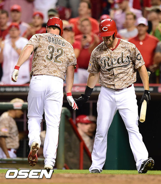 12일(한국시간) 신시내티에서 열린 신시내티 레즈와 LA 다저스의 경기 6회말 1사에서 신시내티 브루스가 우중월 솔로 홈런을 치고 환호하고 있다.