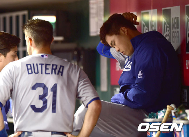 류현진이 더그아웃에서 낙담한 표정을 짓자 부테라가 위로하고 있다./ youngrae@osen.co.kr