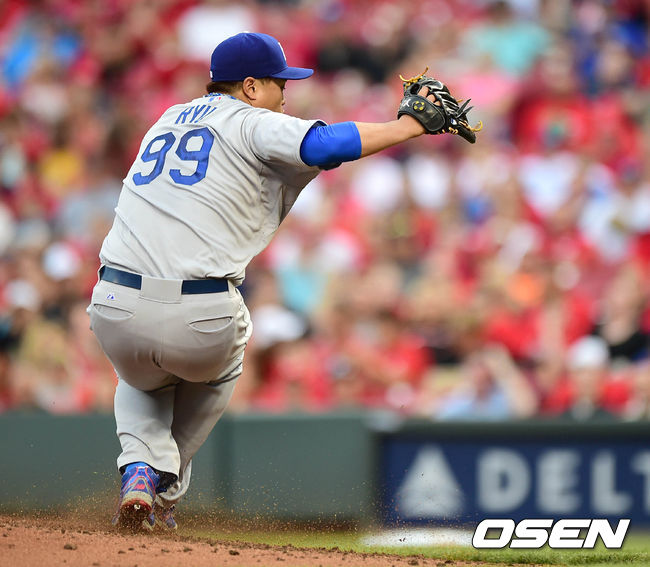 류현진이 투구 중 미끌어지는 아찔한 순간을 당하고 있다. 류현진은 경기 전 갑작스런 라미레즈의 결장, 타격 방해, 그리고 신시내티 주루플레이 중 일어난 3루심과의 2루주자의 접촉에 대한 챌린저 포기가 겹치며 이 여파로 4실점 하며 패전 투수가 됐다./ youngrae@osen.co.kr