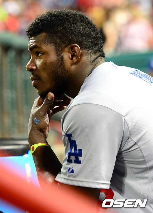 LA 다저스 푸이그가 더그아웃에 앉아 그라운드를 바라보고 있다./ youngrae@osen.co.kr